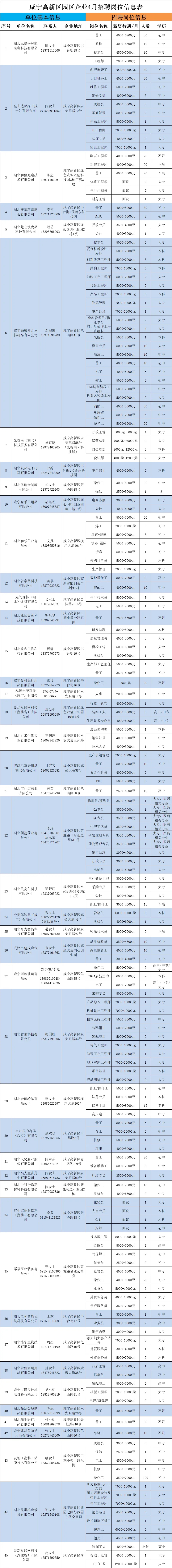 > 咸宁高新区园区企业4月招聘信息(附岗位表)