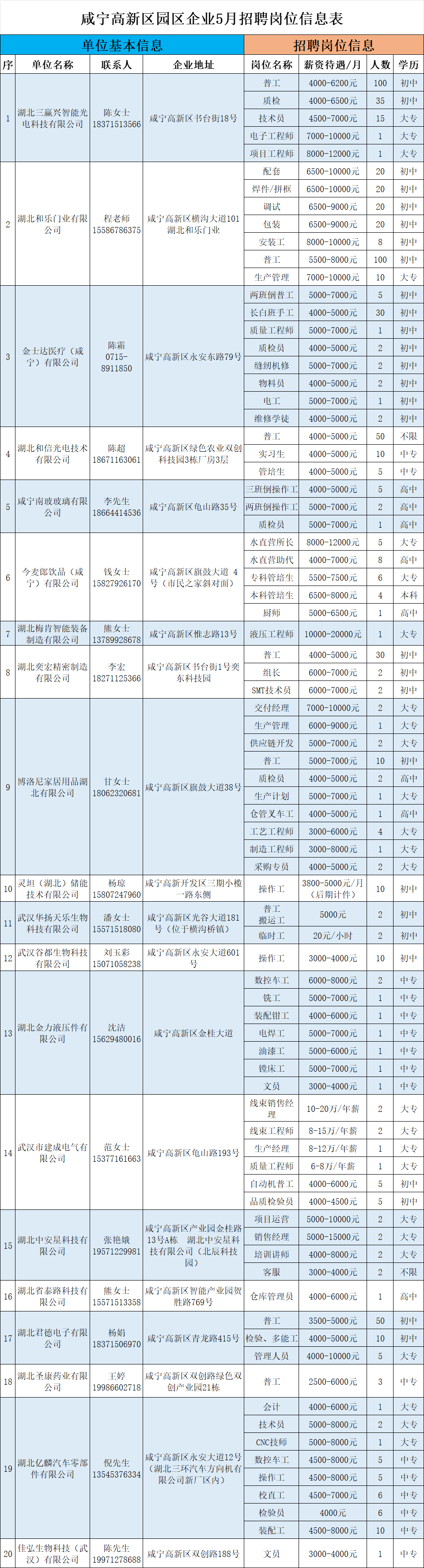 > 咸宁高新区园区企业2025年5月招聘信息(附岗位表)