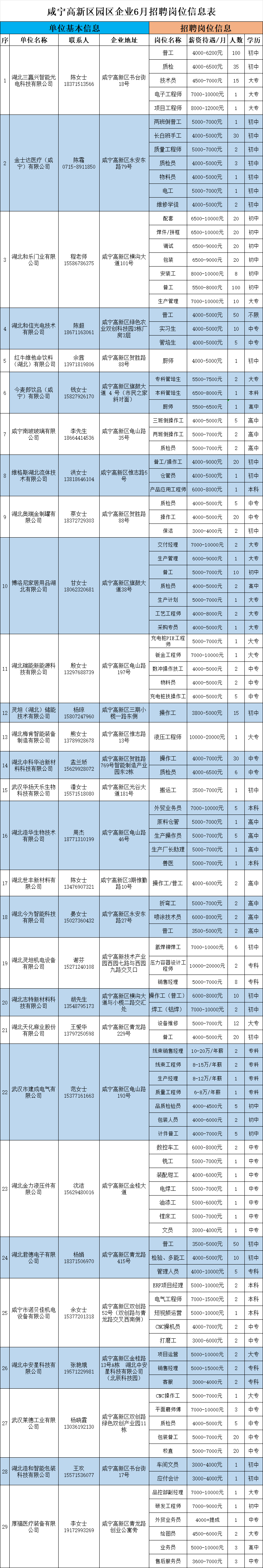 > 咸宁高新区园区企业2025年6月招聘信息(附岗位表)