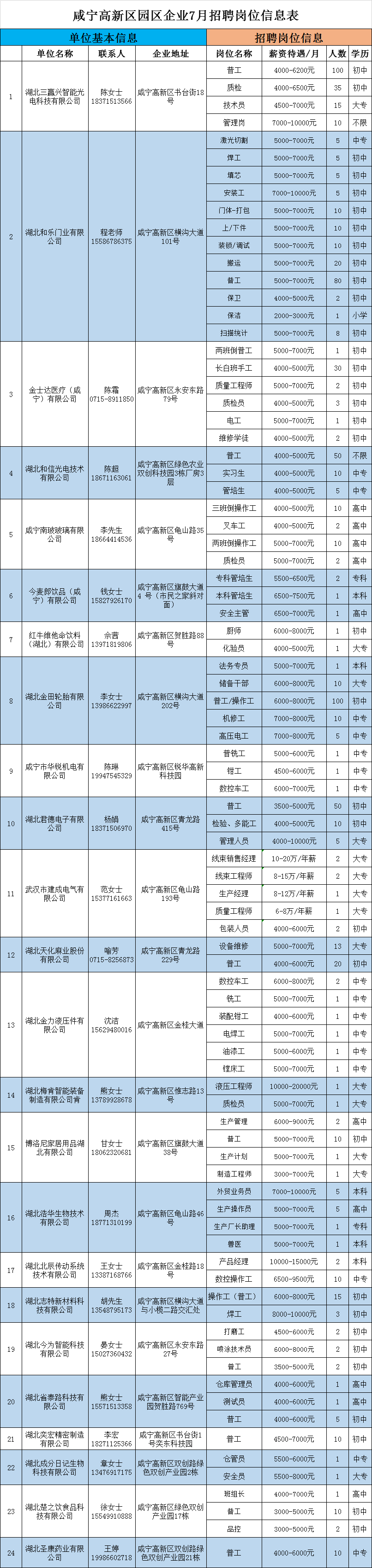 咸宁高新区企业招聘发布,请联系高新区办公室
