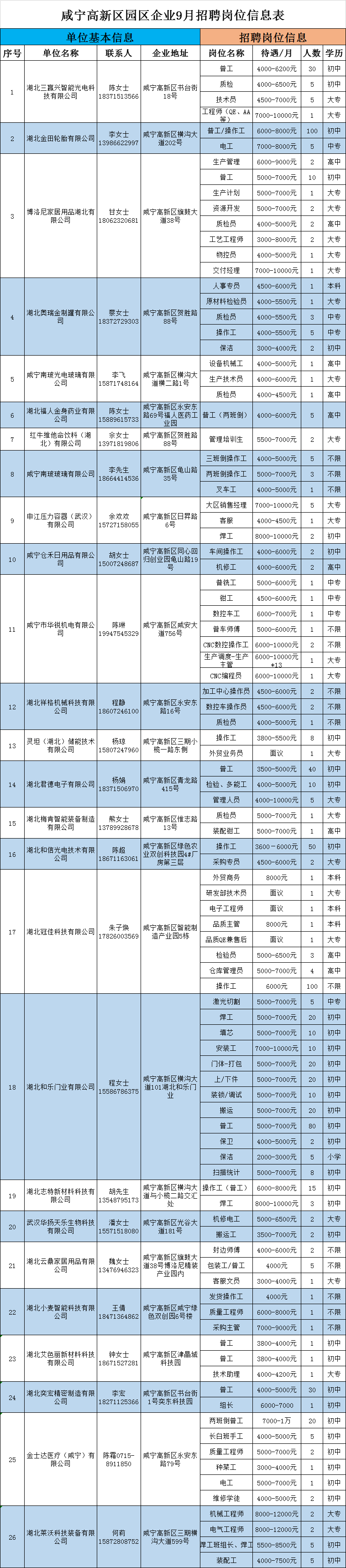 咸宁高新区企业招聘发布,请联系高新区办公室