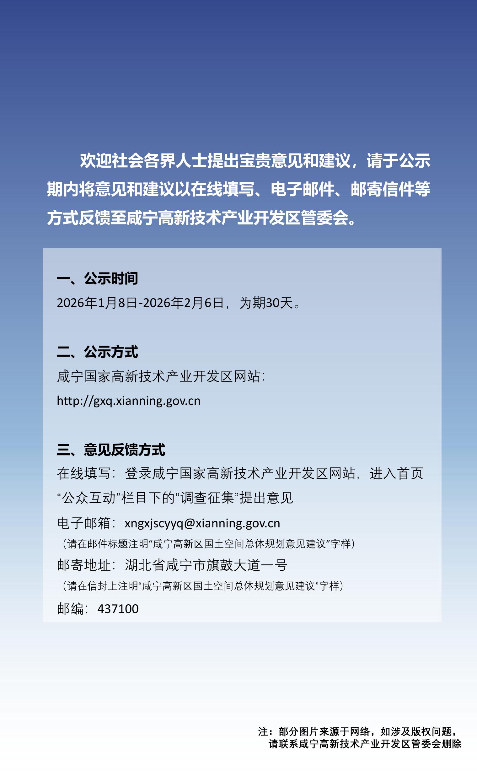 名 称: 咸宁高新技术产业开发区国土空间总体规划草案公示 发布日期: 2026年01月08日