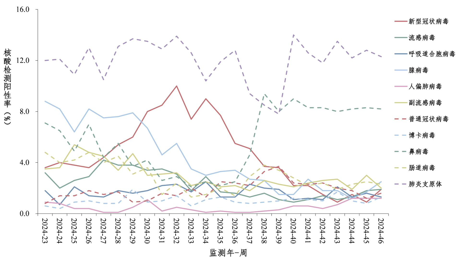 通报称,中疾控对全国哨点医院(不含港澳台)采集的门急诊流感样病例和住院严重急性呼吸道感染病例的呼吸道样本,开展新型冠状病毒、流感病毒、呼吸道合胞病毒、腺病毒、人偏肺病毒、副流感病毒、普通冠状病毒、博卡病毒、鼻病毒和肠道病毒等10种病毒以及肺炎支原体在内的多种呼吸道病原体检测。