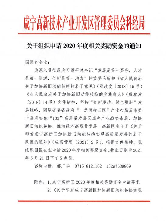 附件1:咸宁高新区2020年度相关奖励资金申请细则