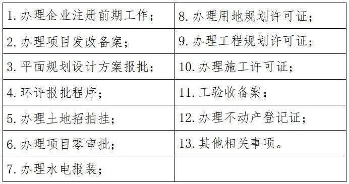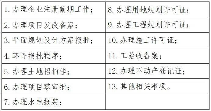 (一)一窗受理代办。专门配备综合素质高、业务能力强,负责企业的业务咨询、无偿代办及业务联络,受理各类项目代办帮办事项,确保企业项目负责人办事“只进一扇门,只找一个人”。全面实施“首问负责”和“一次性告知”制.对于进入代办帮办程序的事项,项目代办员(项目秘书)必须在规定工作日内坚持“能快则快、应办尽办”的原则代办完成工作事项。同时跟踪项目事项审批进程,及时向企业负责人反馈项目审批办理进展情况,适时与审批部门及相关单位进行协调沟通,直至办结完成将结果送达企业负责人。