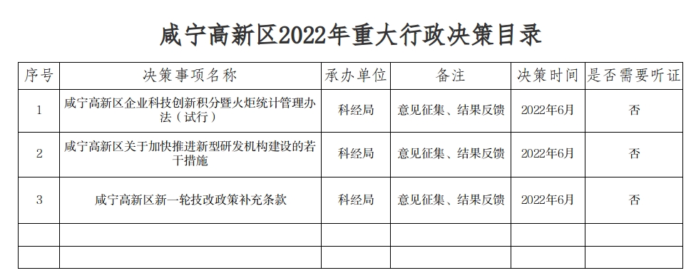 名 称: 咸宁高新区2022年重大行政决策目录 发布日期: 2022年03月02日