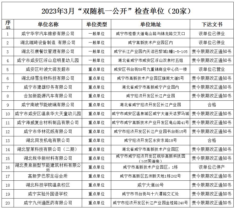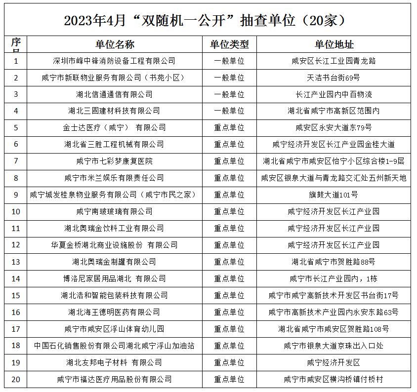 根据“双随机、一公开”消防监管工作要求,咸宁高新技术产业开发区消防救援大队现将“双随机 一公开”2023年4月份抽查名单,2023年3月份检查结果公示如下: