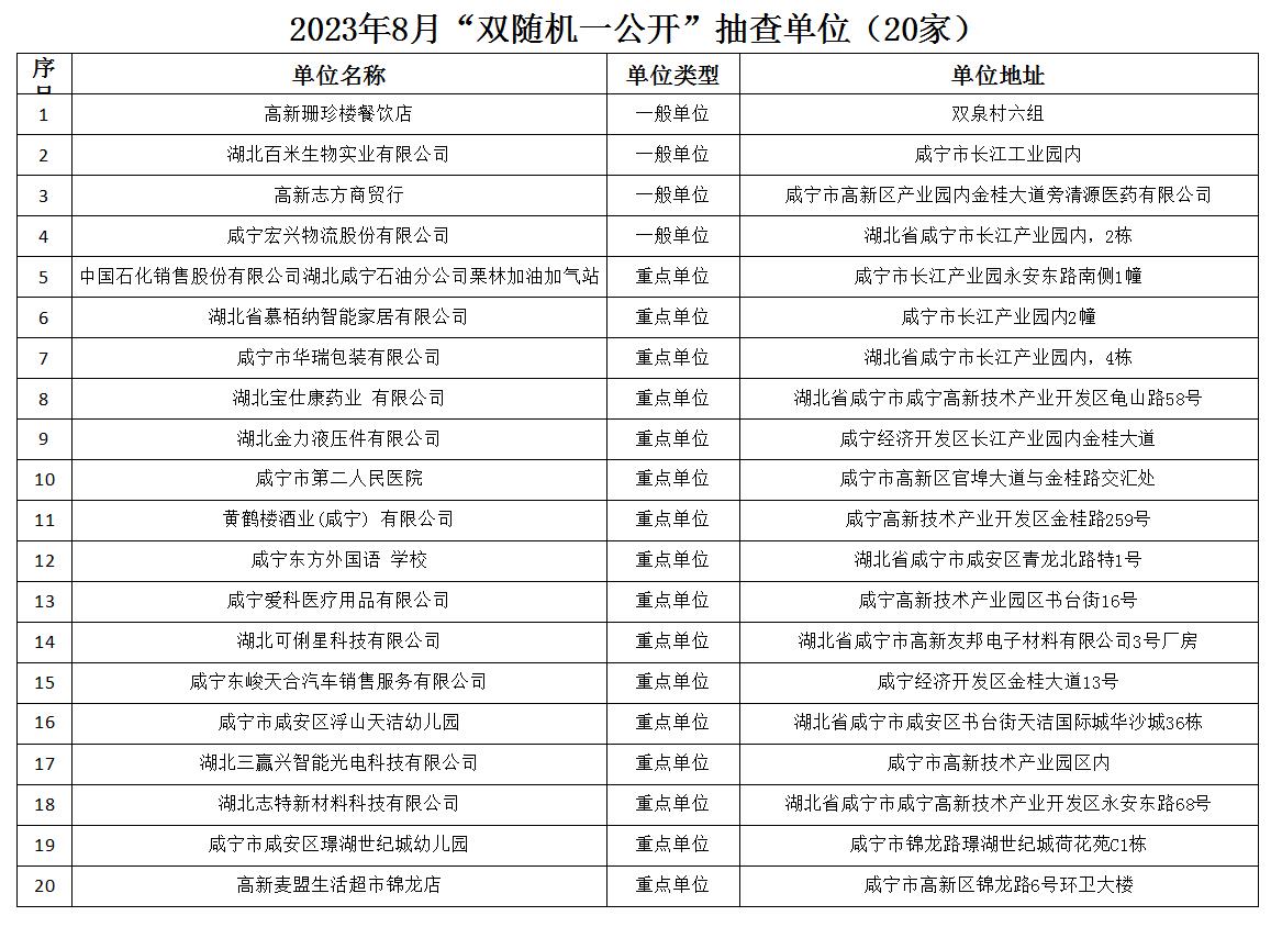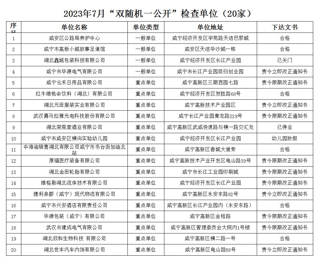 根据“双随机、一公开”消防监管工作要求,咸宁高新技术产业开发区消防救援大队现将“双随机 一公开”2023年8月份抽查名单,2023年7月份检查结果公示如下: