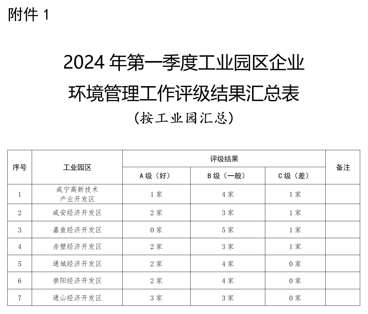 附件:1.2024年第一季度工业园区企业环境管理工作评级结果汇总表(按工业园汇总)