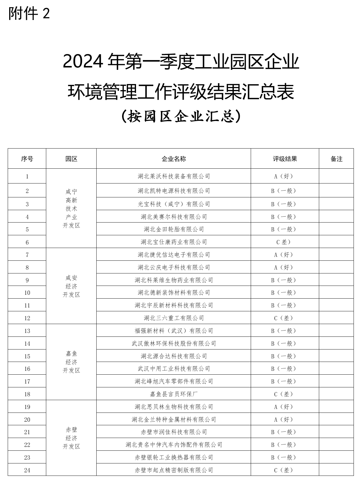 2.2024年第一季度工业园区企业环境管理工作评级结果汇总表(按园区企业汇总)