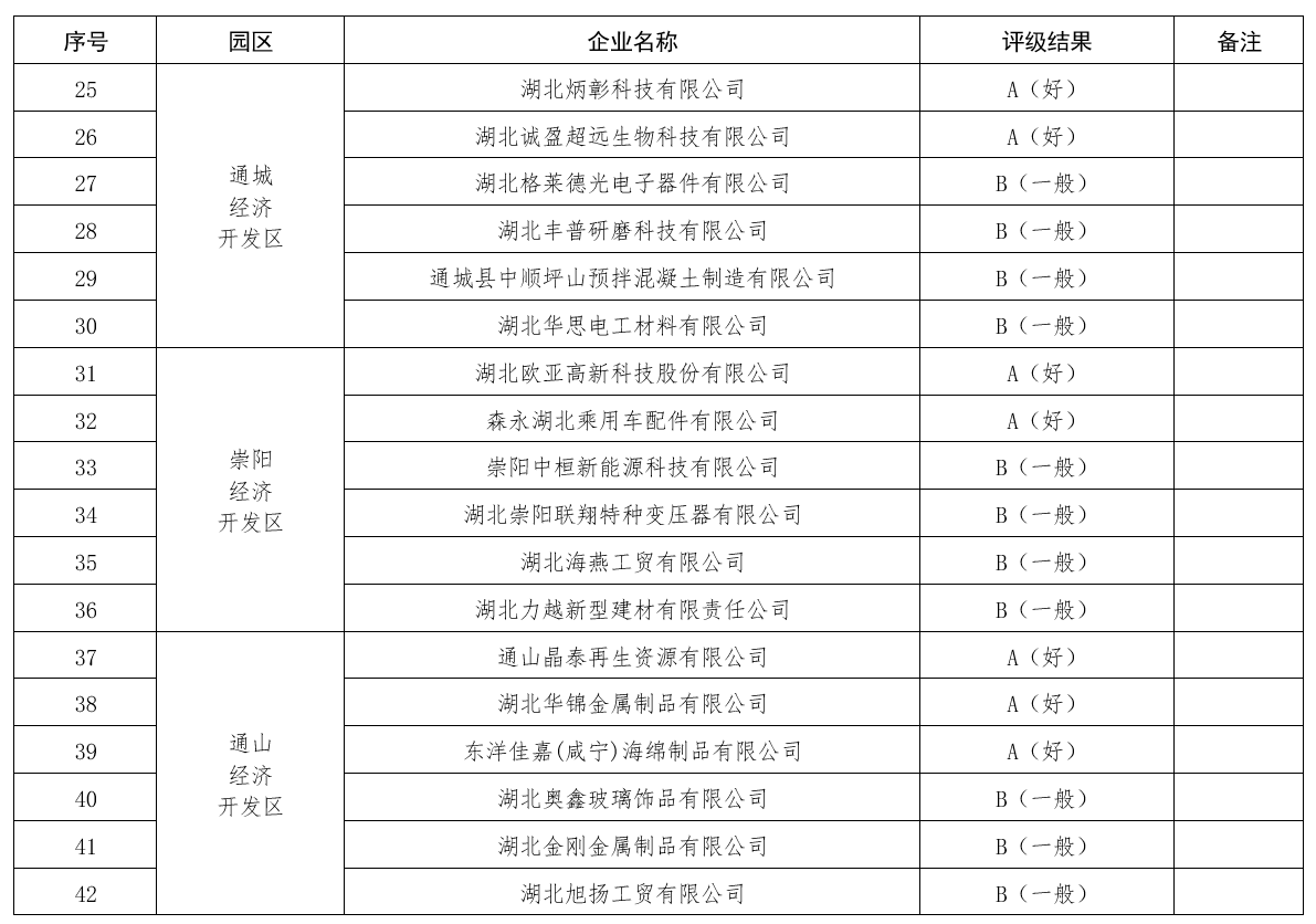 评级结果:a级(好)企业12家、b级(一般)企业26家、c级(差)企业4家,其中:咸宁高新技术产业开发区a级1家、b级4家、c级1家;咸安经济开发区a级2家、b级3家、c级1家;嘉鱼经济开发区b级5家、c级1家;赤壁经济开发区a级2家、b级3家、c级1家;通城经济开发区a级2家、b级4家;崇阳经济开发区a级2家、b级4家;通山经济开发区a级3家、b级3家。