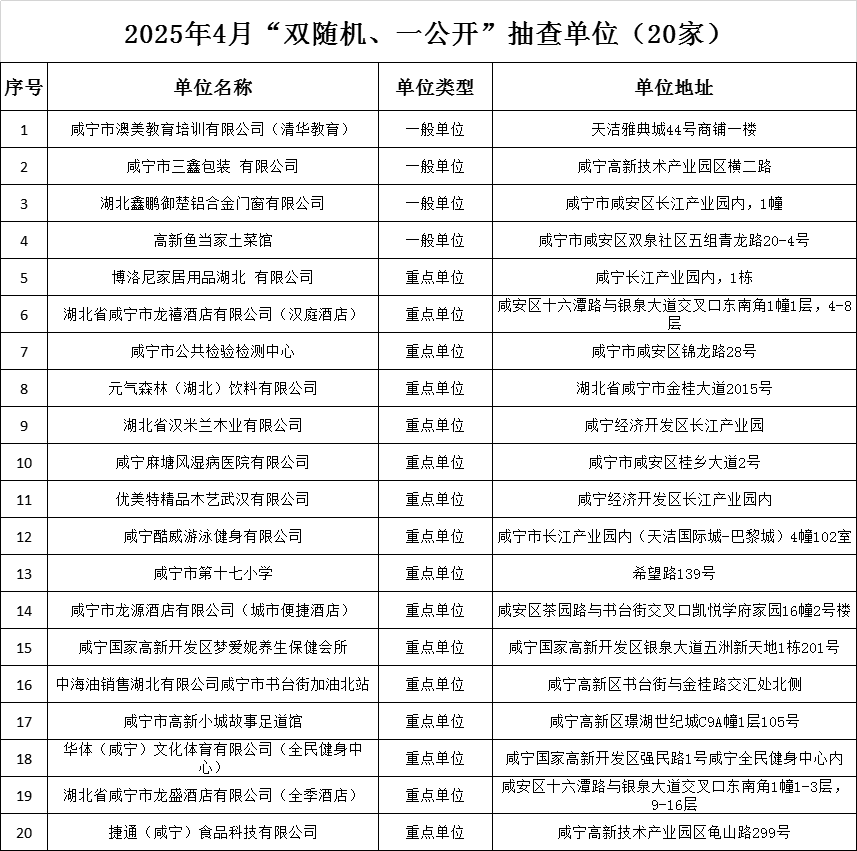 根据“双随机、一公开”消防监管工作要求,咸宁高新技术产业开发区消防救援大队现将“双随机、一公开”2025年4月份抽查名单,2025年3月份检查结果公示如下: