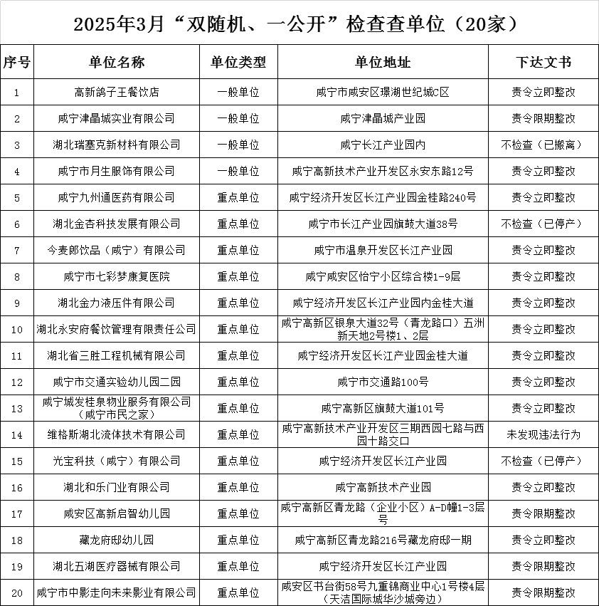 2025年3月份我大队检查20家重点单位,(如下图所示),责令限期整改4家,责令立即整改12家。