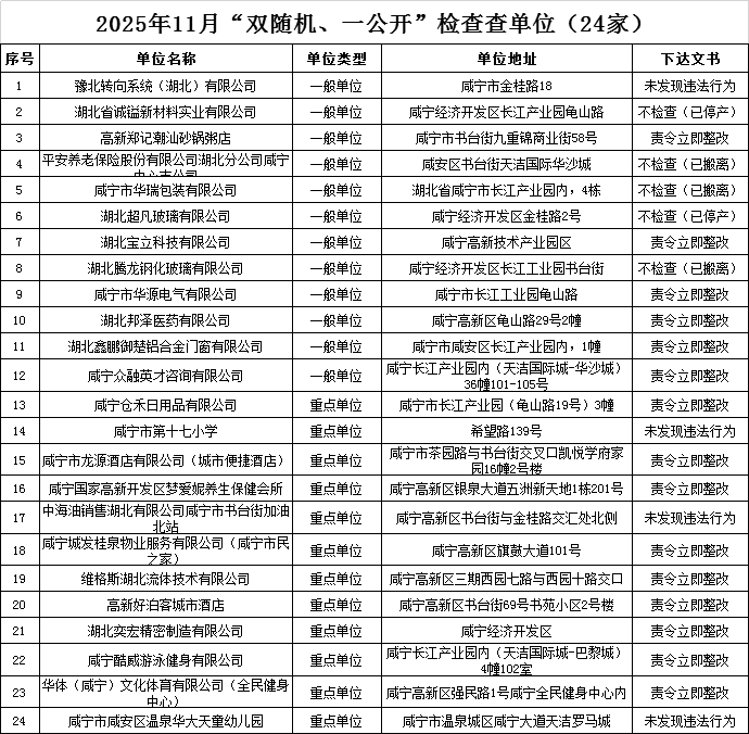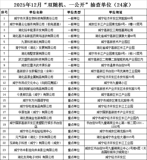 根据“双随机、一公开”消防监管工作要求,咸宁高新技术产业开发区消防救援大队现将“双随机、一公开”2025年12月份抽查名单,2025年11月份检查结果公示如下: