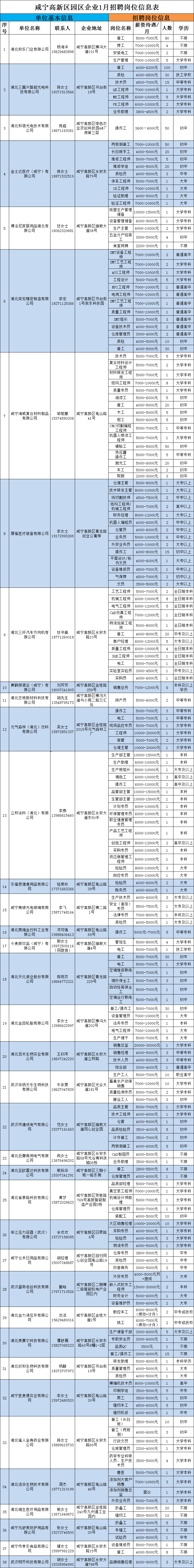 名 称: 咸宁高新区发布2024年1月份企业招聘信息(附岗位表) 发布日期: 2024年01月15日