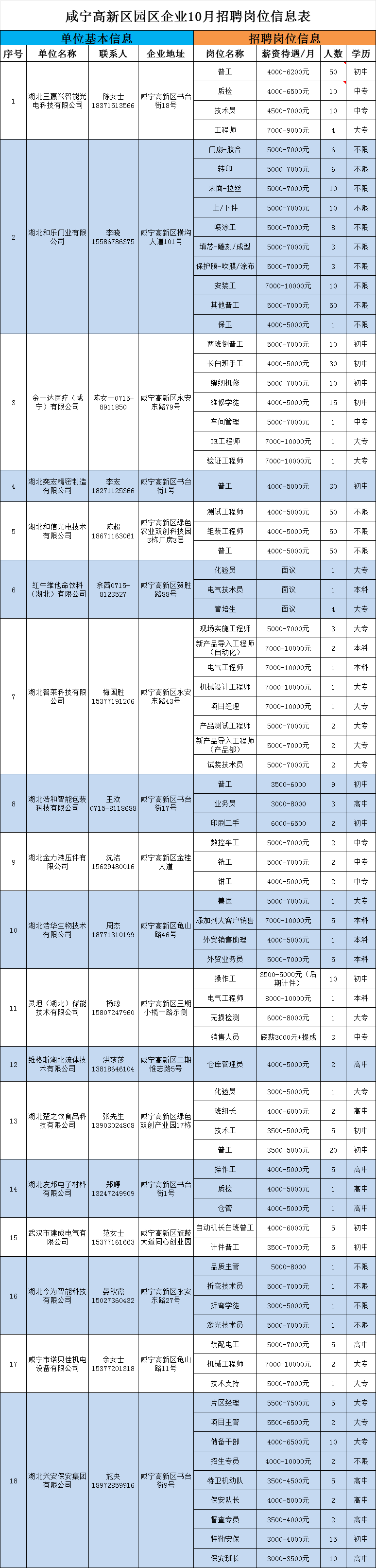 名 称: 咸宁高新区园区企业2024年10月招聘信息(附岗位表) 发布日期: 2024年10月16日