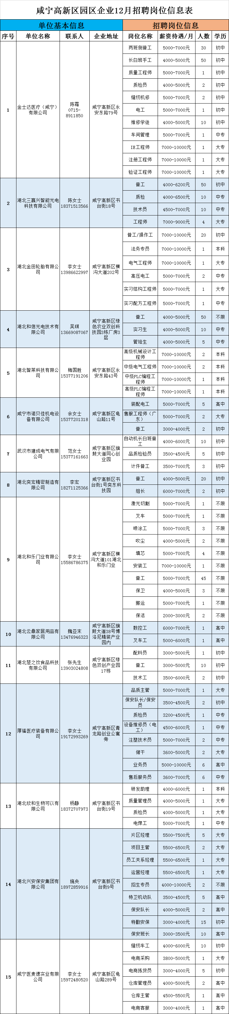名 称: 咸宁高新区园区企业2024年12月招聘信息(附岗位表) 发布日期: 2024年12月16日