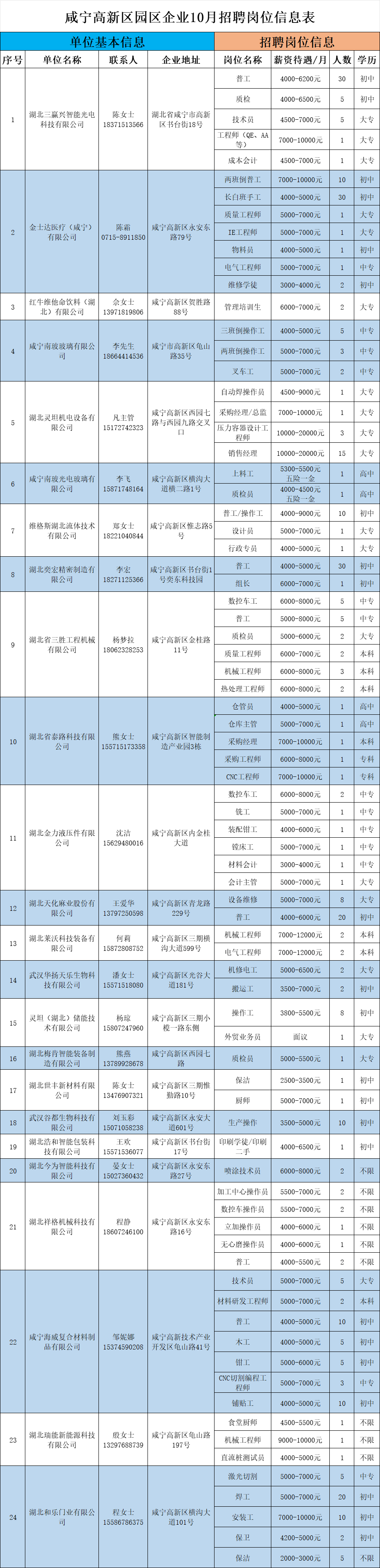 名 称: 咸宁高新区园区24家企业10月份招聘信息岗位表 发布日期: 2025年10月15日