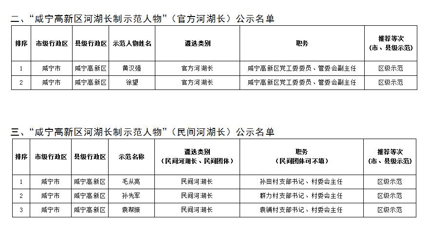经基层推荐、相关单位申报和综合评审,在省、市两级创建的基础上,拟差额遴选出区级示范河库6个、示范人物7个。为体现公开、公正、公平原则,现将13个拟遴选对象名单予以公示,听取社会各界意见,接受广大群众监督。如有意见和建议,可向咸宁高新区河湖长制办公室反映。