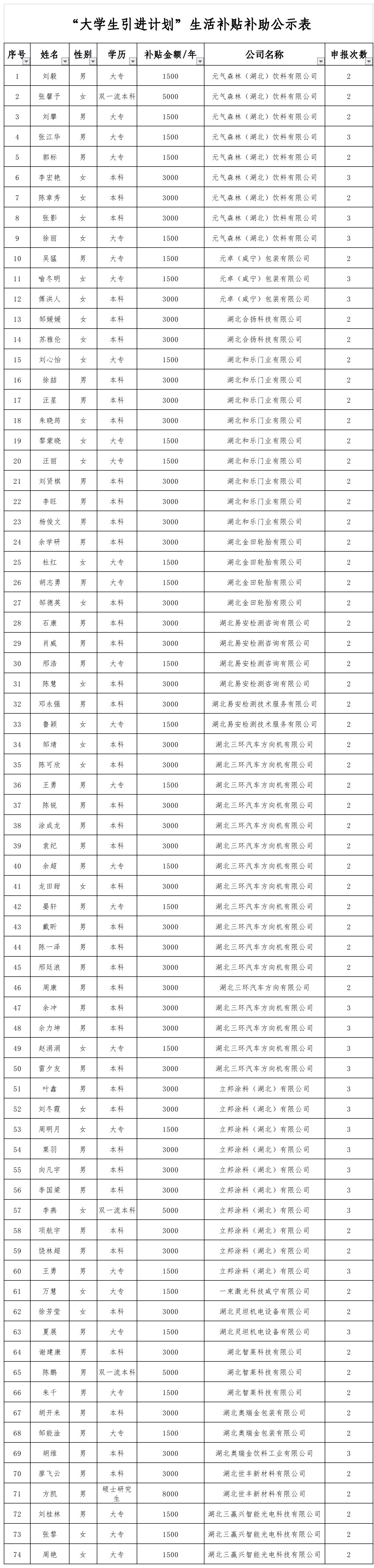 根据《关于印发咸宁高新区贯彻落实咸宁市关于“大学生引进计划”的实施意见工作方案的通知》(咸高办发〔2021〕6号)文件,2025年第一批次“大学生引进计划”生活补贴补助共有74人符合条件,其中硕士生1人、双一流大学本科生3人、本科生43、专科生27人。现将2025年第一批次“大学生引进计划”生活补贴补助情况进行公示,公示期7天(2025年6月26日-2025年7月2日)。