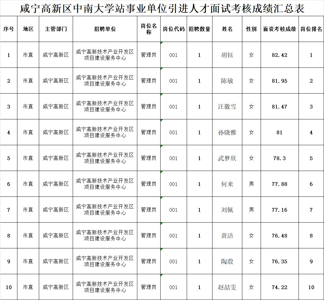 根据《咸宁市2024年“引才专列”活动 中南大学站事业单位引进人才公告》有关安排,咸宁高新区组织开展了2024年“引才专列”活动面试考核工作。现将面试考核成绩及排名情况予以公告。
