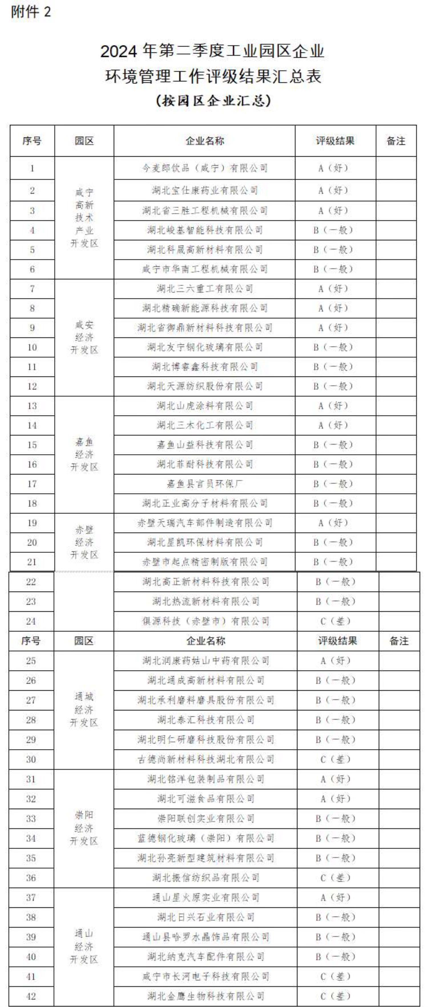 名 称: 咸宁市通报2024年第二季度工业园区企业环境管理工作评级结果 发布日期: 2024年08月13日