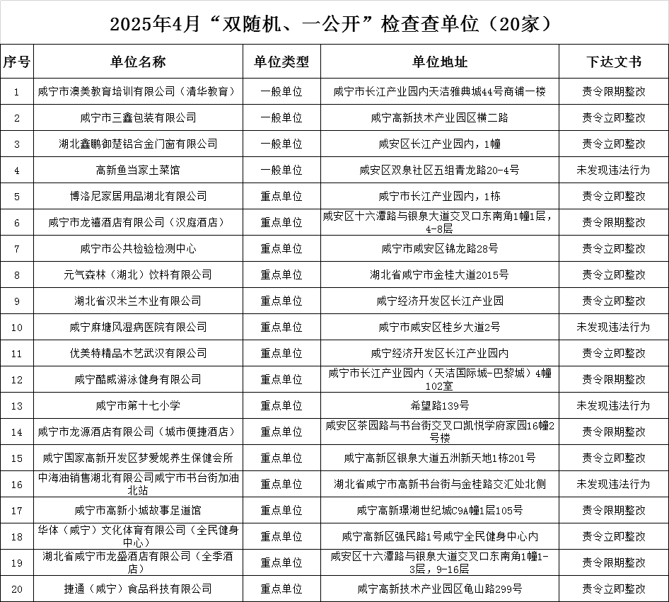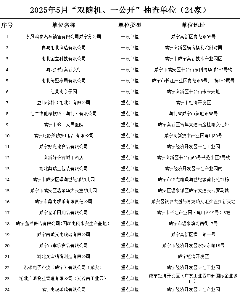 根据“双随机、一公开”消防监管工作要求,咸宁高新技术产业开发区消防救援大队现将“双随机、一公开”2025年5月份抽查名单,2025年4月份检查结果公示如下: