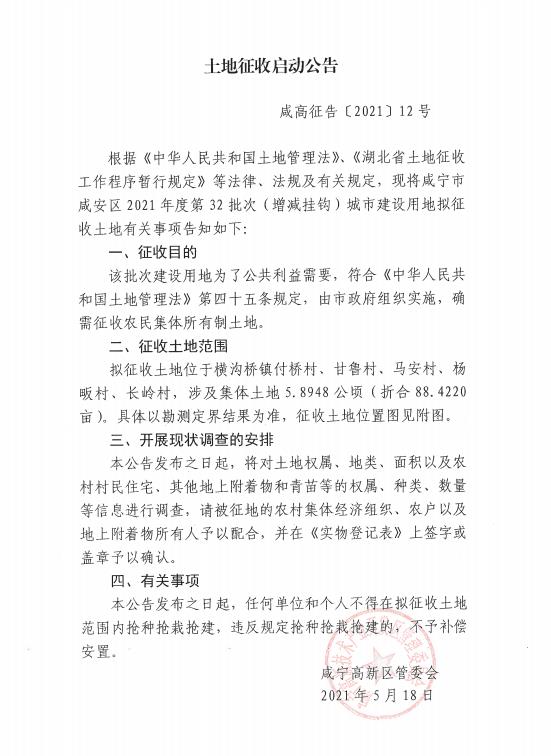 名 称: 土地征收启动12号公告 发布日期: 2021年05月21日