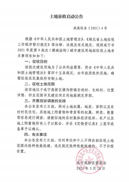名 称: 2021年度第9批次土地征收启动公告 发布日期: 2021年03月19日