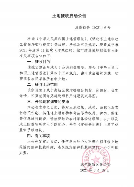 名 称: 2021年度第11批次土地征收启动公告 发布日期: 2021年03月19日