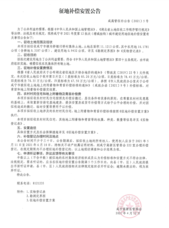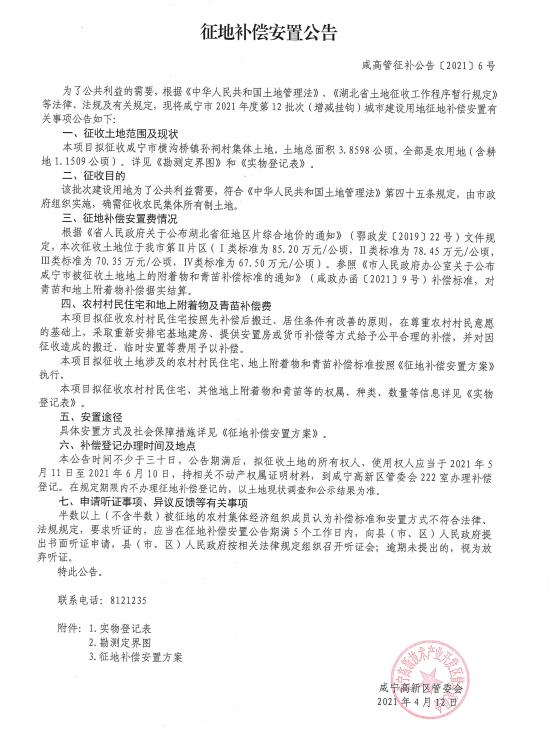 名 称: 咸宁市2021年度第12批次(增减挂钩)城市建设用地征地补偿安置公告 发布日期: 2021年04月26日
