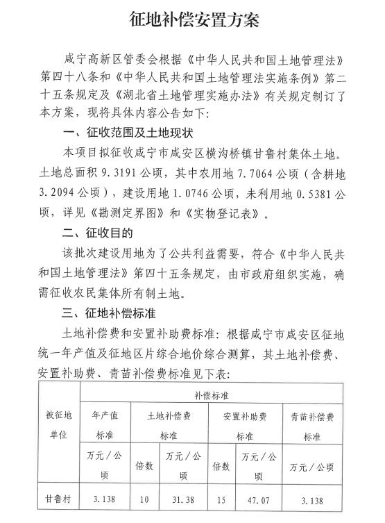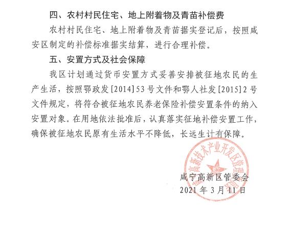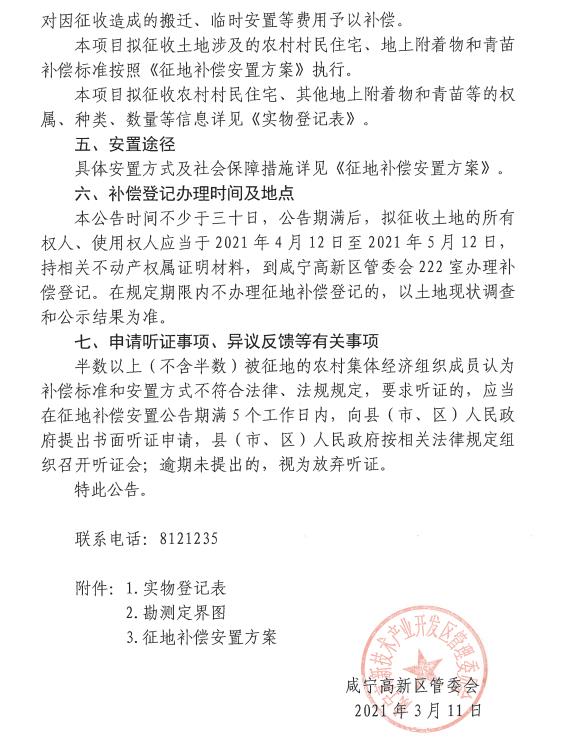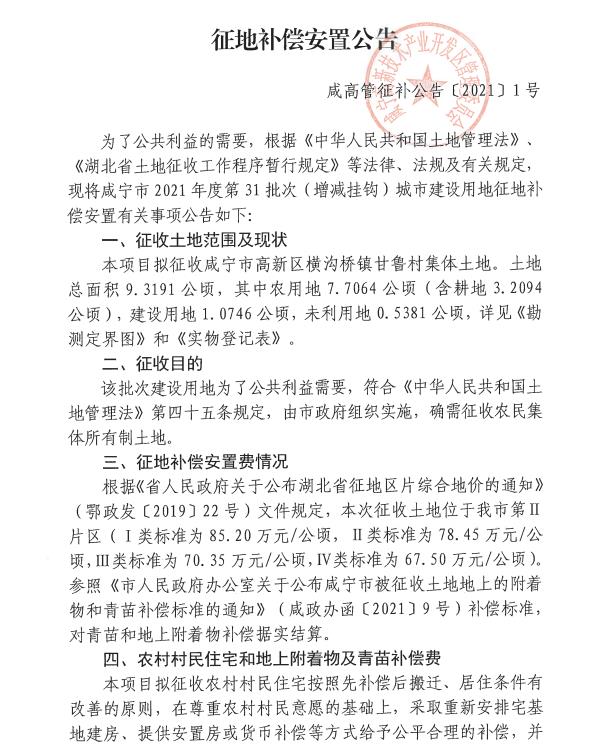 名 称: 咸宁市2021年度第31批次征地补偿安置公告 发布日期: 2021年03月12日