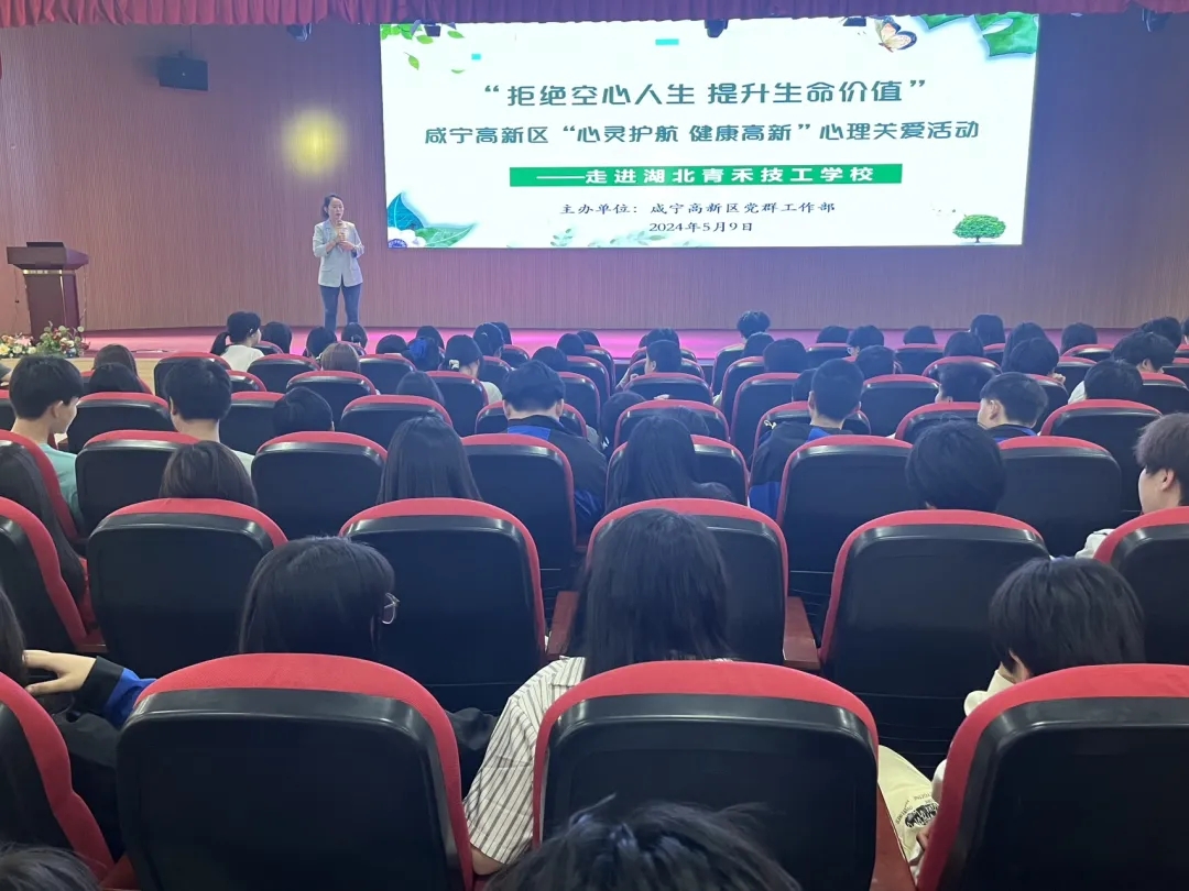 为全面提升学生心理素养,帮助学生树立积极健康的人生观,5月9日,咸宁高新区党群工作部深入湖北青禾技工学校开展心理健康教育讲座。活动邀请湖北科技学院附属第二医院心理康复治疗中心副主任、国家心理治疗师吴芳为200余名学生带来心理健康关爱服务。